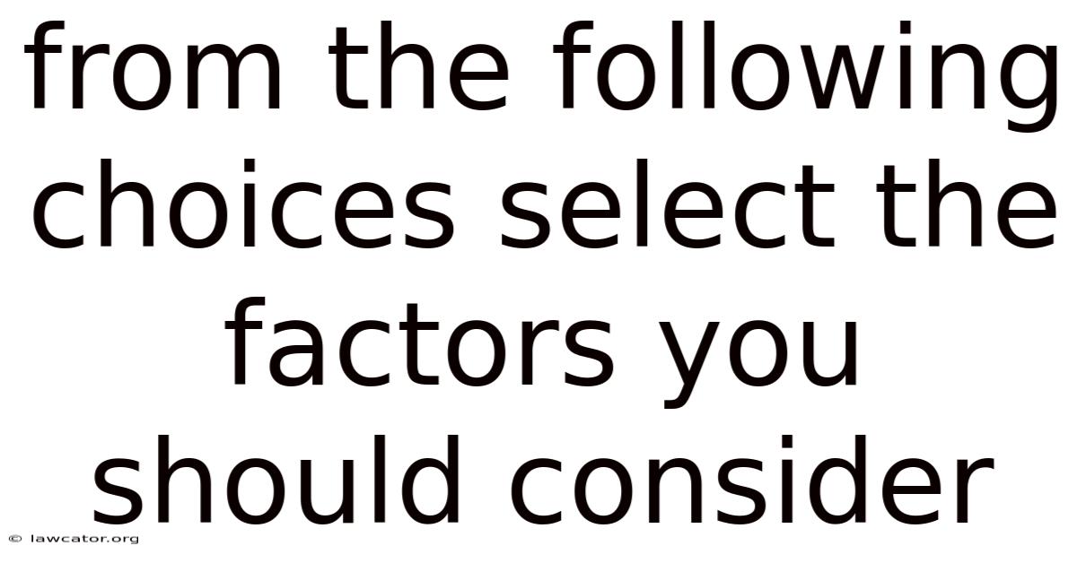The query "from the following choices select the factors you should consider" appears to be incomplete or missing the specific list of options or context. To craft a meaningful and comprehensive article, I need clarification on the specific factors or scenarios you want to explore. For example: